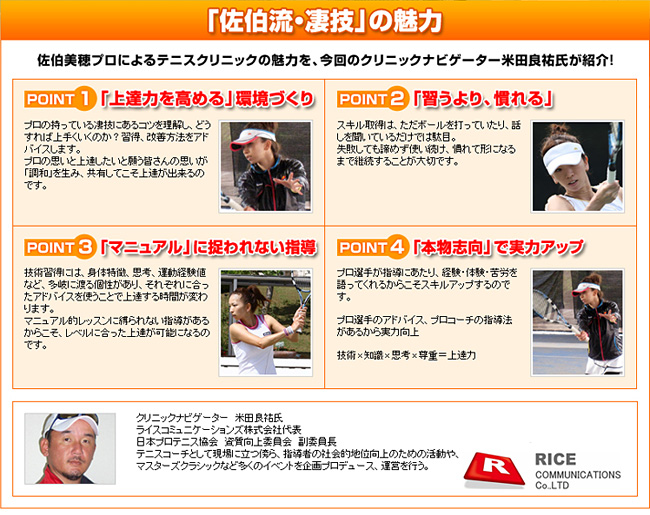 | イベント内容 | ★クリニック概要★ 元世界ランク56位!グランドスラムの4大会全てで初戦突破を果たすなど、日本女子テニス界の一時代を築いた佐伯美穂プロの第2回クリニックの開催が決定! 日本の女子選手としては珍しい「攻撃的」なテニスが持ち味の佐伯プロが特に得意としていた『フォアハンド』を徹底的に伝授します! 前回の1月30日に開催した第1回の内容の復習と、ダブルスを想定した実践編を行いますので、 前回の参加者様は復習+応用になります。 今回が初参加の方は基礎から学べます。 約2時間の間、フォアのみを打ち続けます! ⇒⇒⇒第1回「佐伯流・プロの凄技」の様子 ![]() ⇒⇒⇒クリニックナビゲーター:米田良祐オフィシャルブログはこちら ![]() ⇒⇒⇒佐伯美穂プロ・オフィシャルブログ ★スケジュール★ 2011年7月9日(土) 12:30~13:00 受付 13:00~15:30 クリニック(2面進行) ★参加資格★ ・男女は問いません。 ・プレーレベル:中級以上~上級 ・フォアハンドストロークを本気でレベルUPさせたい方。 ★特別協賛★ ellesse(エレッセ) VAAM(ヴァーム) |